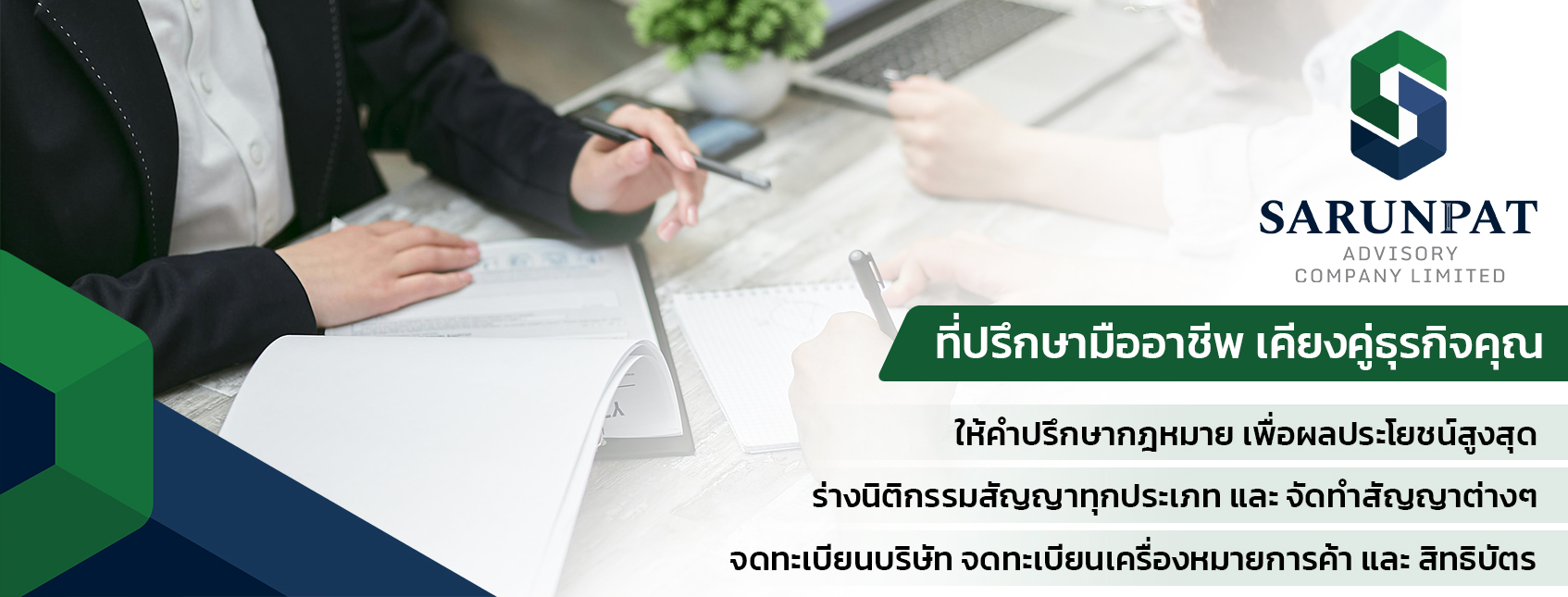 บริษัท ศรัณย์พัชร์ ลีเกิ้ล แอนด์ แอคเคาติ้ง จำกัด เรามีบริการให้คำปรึกษาและดำเนินการด้านกฏหมาย โดยทีมงานทนายความมืออาชีพ นอกจากนั้นเรายังมีบริการด้านบัญชี, ภาษี และงบการเงิน ที่คอยสนับสนุนธุรกิจของคุณให้ก้าวต่อไปได้อย่างมั่นคง และสบายใจ